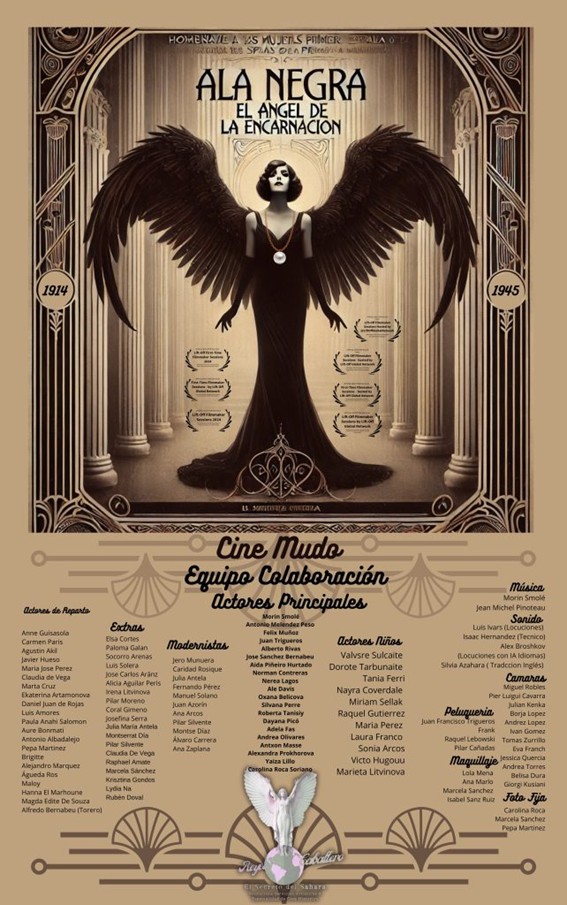 Sinopsis | Ala Negra “El Ángel de la Encarnación” es una película de cine independiente, autoral y de mirada femenina, homenaje a las mujeres espías durante la Primera y la Segunda Guerra Mundial. Rodada en localizaciones de España, Francia y Alemania, y concebida sin diálogos, la obra se sostiene en una puesta en escena poética y simbólica. A través de la luz, el silencio y la corporalidad, la cámara recorre las huellas de 37 mujeres espías de diferentes nacionalidades que desafiaron los roles de género arriesgaron sus vidas en las sombras de Europa. La ausencia de palabras se convierte en un grito visual que atraviesa el tiempo para hablar del control sobre los cuerpos, del poder de la información y de la belleza como forma de resistencia. Las cartelas de cine mudo están locutadas en siete idiomas. |